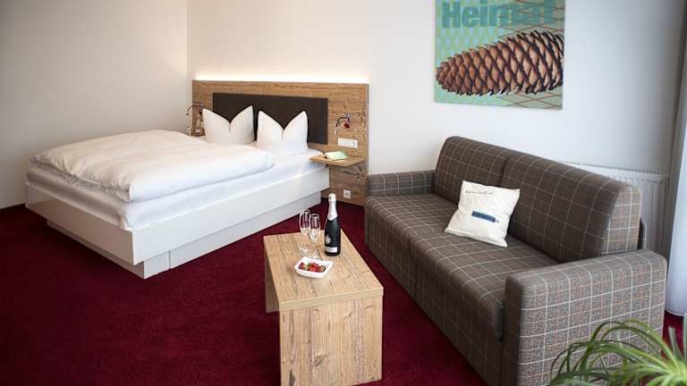 Die Zimmer im Hotel Garni Schmieder's Ochsen sind im charmanten Landhausstil eingerichtet und bieten eine gemütliche Atmosphäre. Jedes Zimmer verfügt über ein modernes Badezimmer und Sat-TV. Einige Zimmer haben auch einen Balkon, von dem aus Sie die schöne Umgebung genießen können. Für zusätzlichen Komfort können Sie auch in der nur 80 Meter entfernten Pension des Hotels übernachten.