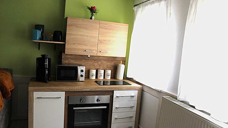 Die Wohnung umfasst zwei Zimmer und bietet ein Schlafzimmer sowie eine Küchenzeile mit Kühlschrank und Ofen. Ein Flachbild-TV, ein Sitzbereich und ein Badezimmer mit Dusche sind ebenfalls vorhanden. Handtücher und Bettwäsche werden bereitgestellt.