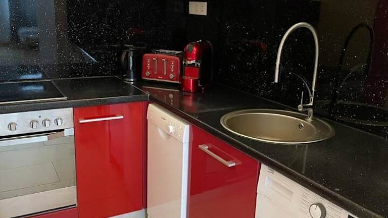 Die Ferienwohnung verfügt über zwei Schlafzimmer und ist mit einer Küche ausgestattet, die einen Kühlschrank und einen Geschirrspüler umfasst. Zur Ausstattung gehören zudem ein Flachbild-TV, ein Sitzbereich und ein Badezimmer mit Dusche. Handtücher und Bettwäsche sind ebenfalls vorhanden.