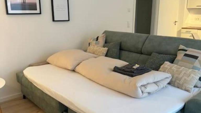 Die Ferienwohnung bietet ein Schlafzimmer, ein Wohnzimmer sowie eine gut ausgestattete Küche. Die Küche ist mit einem Kühlschrank und einem Geschirrspüler ausgestattet.