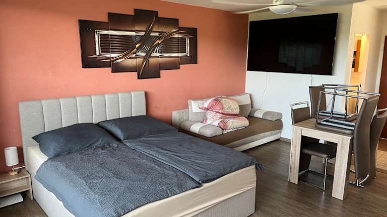 Die Wohnung verfügt über ein Schlafzimmer, ein Badezimmer, einen Balkon mit Blick auf die Stadt und eine voll ausgestattete Küche. Sie finden hier alles, was Sie für einen komfortablen Aufenthalt benötigen, einschließlich Bettwäsche und Handtücher. Entspannen Sie sich vor dem Flachbild-TV und nutzen Sie das kostenfreie WLAN in der gesamten Wohnung.