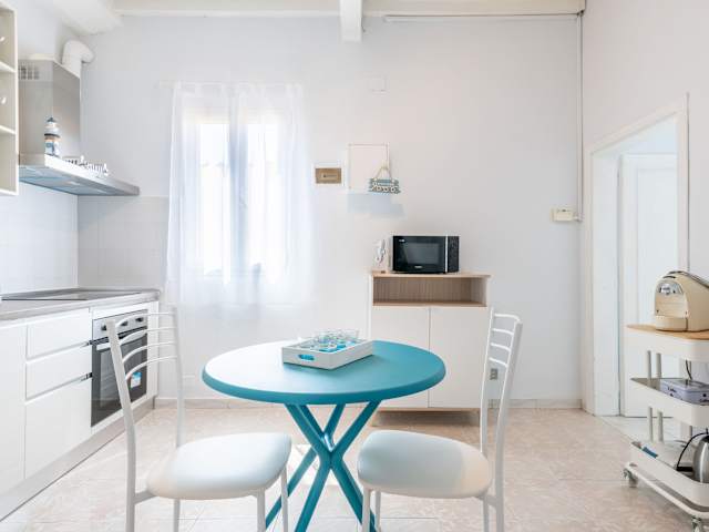 Die Ferienwohnung besteht aus einem Schlafzimmer, einem Wohnzimmer und einer voll ausgestatteten Küche, die mit einem Kühlschrank und einer Kaffeemaschine ausgestattet ist. Des Weiteren verfügt sie über ein Badezimmer mit einem Bidet und einer Dusche. Handtücher und Bettwäsche werden zur Verfügung gestellt.