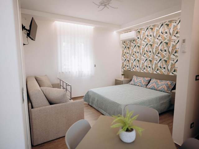 Die Wohneinheiten sind klimatisiert und verfügen über eine voll ausgestattete Küchenzeile mit Kühlschrank und Kaffeemaschine. Des Weiteren gibt es einen Flachbild-TV sowie ein eigenes Badezimmer mit Bidet und Dusche. Sitzgelegenheiten und/oder Essbereiche sind ebenfalls vorhanden.