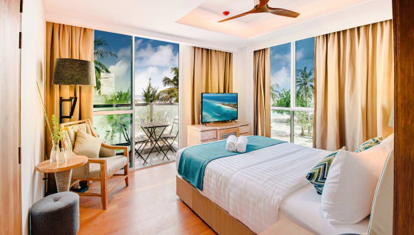 Die Zimmer im Seasalter Maldives sind klimatisiert und entsprechend ausgestattet. Jede Unterkunft verfügt über einen Kleiderschrank, einen Wasserkocher, eine Minibar, einen Safe und einen Flachbild-TV. Die Zimmer bieten ein eigenes Badezimmer mit Bidet, und es sind Bettwäsche sowie Handtücher vorhanden. Die verschiedenen Zimmerkategorien umfassen Deluxe-Doppelzimmer mit und ohne Meerblick und sind zwischen 17 m² groß. Eigenschaften wie WLAN, Deckenventilatoren und Reinigungsservice sind in allen Zimmern verfügbar.