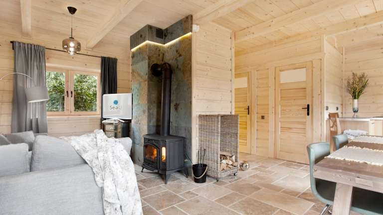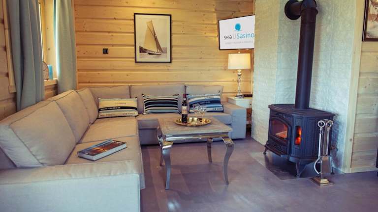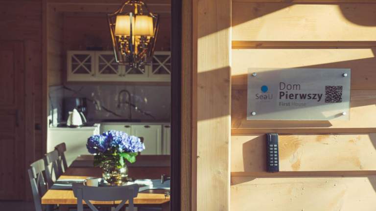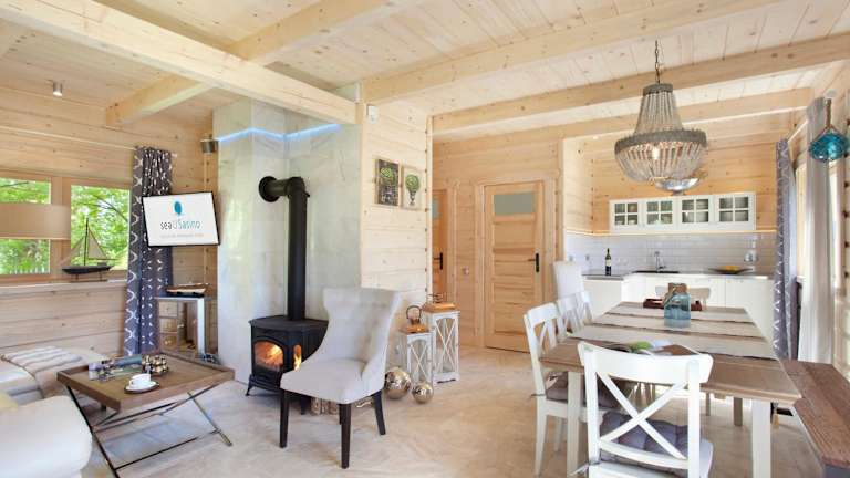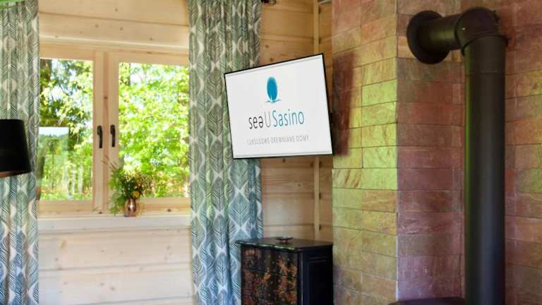 Die Unterkünfte im SeaUSasino - Luksusowe Drewniane Domy z Kominkami sind luxuriöse Holzhäuser, die mit modernen Annehmlichkeiten ausgestattet sind. Jedes Haus verfügt über einen gemütlichen Sitzbereich, einen Flachbild-Sat-TV und eine voll ausgestattete Küche mit Kühlschrank, Geschirrspüler, Mikrowelle, Kochfeld, Toaster, Kaffeemaschine und Wasserkocher. Die Zimmer bieten einen herrlichen Blick auf den Garten und verfügen über ein eigenes Bad mit Dusche und Haartrockner.