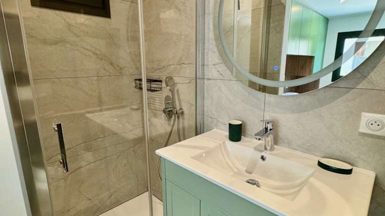 Das Ferienhaus bietet ein Schlafzimmer, ein Badezimmer mit Dusche, einen Sitzbereich sowie eine Küche. Die Unterkunft ist mit einem Flachbild-TV und einem Balkon ausgestattet. Handtücher und Bettwäsche werden bereitgestellt.