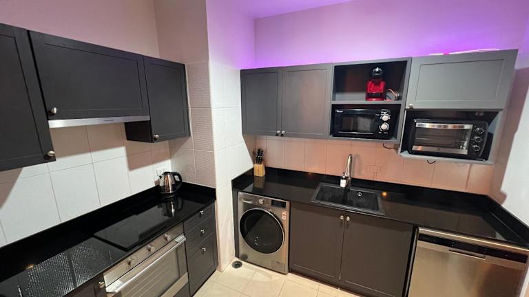 Die Ferienwohnung umfasst 1 Schlafzimmer und ist mit einer Küche ausgestattet, die über einen Kühlschrank und einen Geschirrspüler verfügt. Zur Einrichtung gehören ein Flachbild-TV, ein Sitzbereich und ein Badezimmer mit Bidet. Handtücher und Bettwäsche werden ebenfalls bereitgestellt.