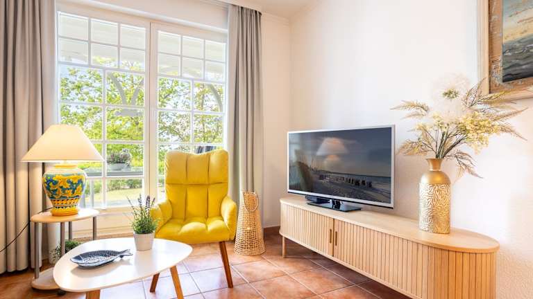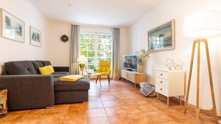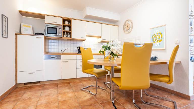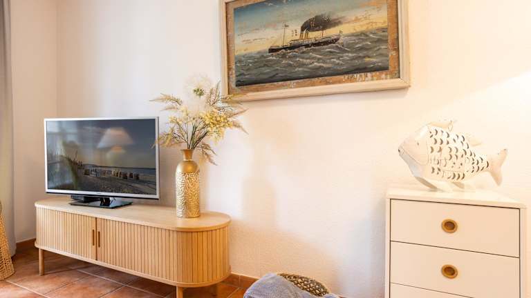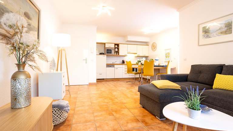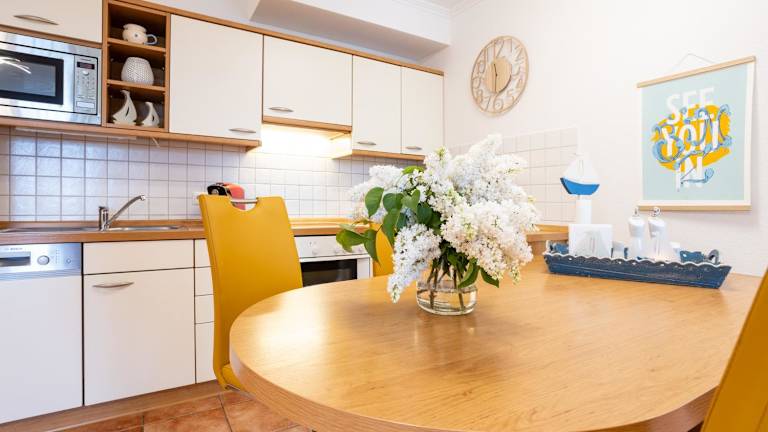 Die Ferienwohnung bietet ein Wohnzimmer mit Essbereich, eine komplett ausgestattete Küche mit Kühlschrank, Geschirrspüler und Ofen, ein Schlafzimmer sowie ein Badezimmer mit Dusche. Ausgestattet ist die Unterkunft zudem mit einem Blu-ray-Player, Handtüchern und Bettwäsche.