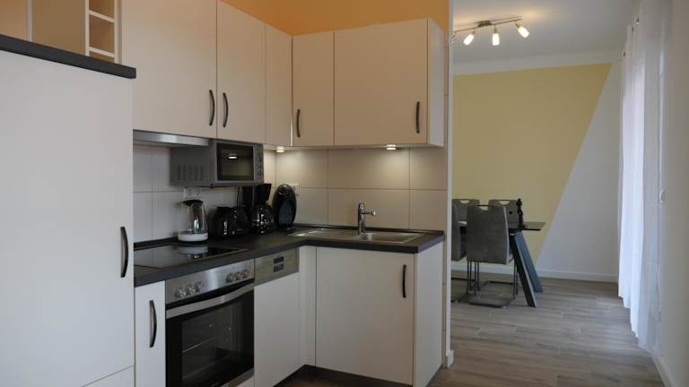 Die Zimmer in der Seeoase Lychen sind mit einem Sitzbereich, einem Flachbild-TV und einer voll ausgestatteten Küche ausgestattet. Die Küche enthält einen Kühlschrank, einen Geschirrspüler, einen Ofen, eine Mikrowelle, eine Herdplatte, eine Kaffeemaschine und einen Wasserkocher. Darüber hinaus steht ein eigenes Badezimmer mit Dusche und Haartrockner zur Verfügung.