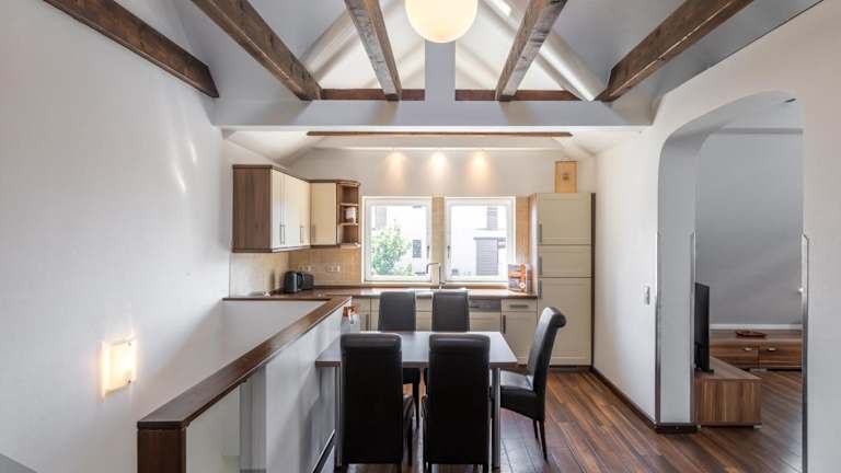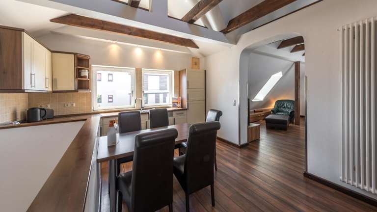 Die Ferienwohnung ist mit einer eigenen Küche ausgestattet, die einen Kühlschrank und einen Geschirrspüler umfasst, was eine selbständige Verpflegung ermöglicht. Handtücher und Bettwäsche werden bereitgestellt.