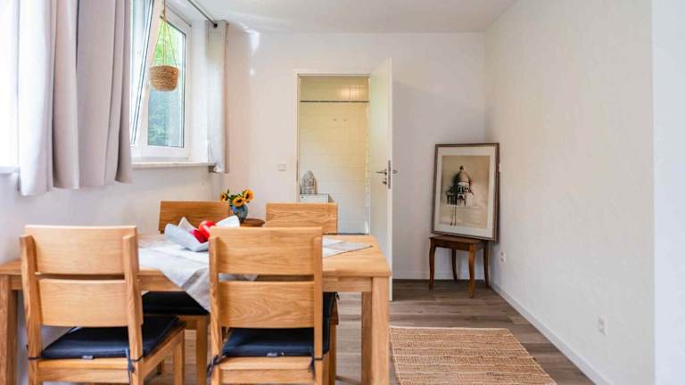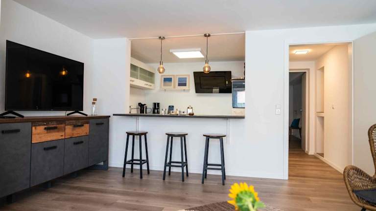 Die Ferienwohnung umfasst ein Schlafzimmer, ein Wohnzimmer und eine voll ausgestattete Küche mit Kühlschrank und Kaffeemaschine. Zudem steht ein Badezimmer mit Dusche und kostenlosen Pflegeprodukten zur Verfügung. Handtücher und Bettwäsche werden bereitgestellt.