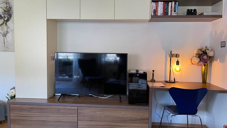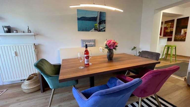 Die Ferienwohnung umfasst zwei Schlafzimmer, ein Wohnzimmer, einen Flachbild-TV, eine gut ausgestattete Küche mit Kühlschrank und Geschirrspüler sowie ein Badezimmer mit Dusche. Handtücher und Bettwäsche werden bereitgestellt.