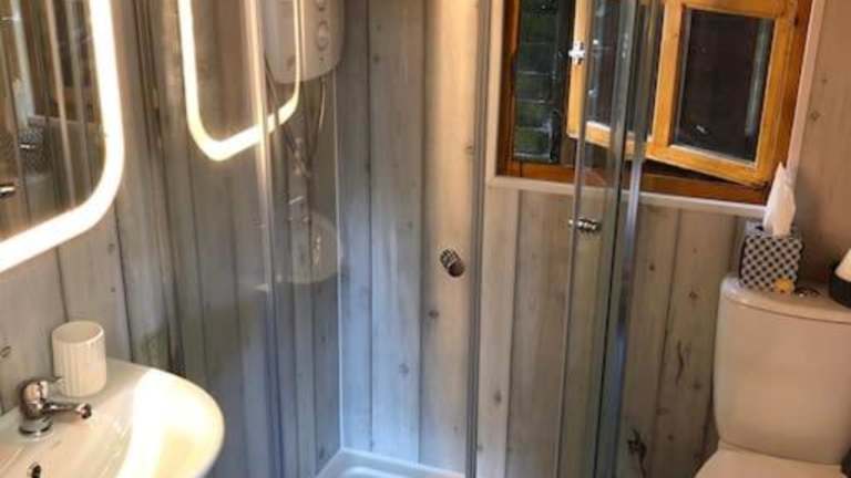 Das Ferienhaus bietet ein Schlafzimmer, ein Badezimmer mit Dusche und Haartrockner sowie Handtücher und Bettwäsche.