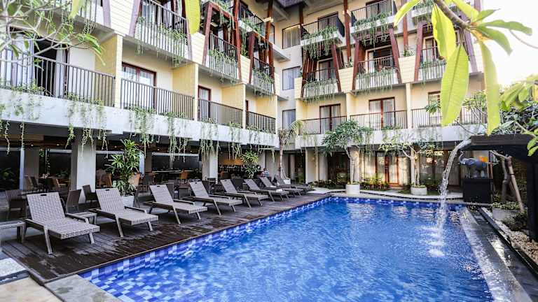 Genießen Sie einen entspannten Aufenthalt im Serela Legian by KAGUM Hotels, das sich nur 10 Gehminuten vom Strand von Kuta und dem Ground Zero Monument entfernt befindet. Das Hotel bietet moderne Zimmer, einen Außenpool und ein Restaurant mit einer vielfältigen Auswahl an asiatischen und westlichen Gerichten. Das freundliche Personal steht Ihnen rund um die Uhr zur Verfügung, um Ihren Aufenthalt so angenehm wie möglich zu gestalten.