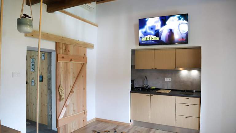 Die Wohneinheiten verfügen über eine voll ausgestattete Küchenzeile, die Mikrowelle, Herdplatte und Wasserkocher umfasst. Ein Esstisch ist ebenfalls vorhanden.