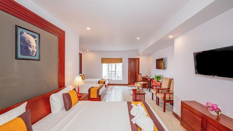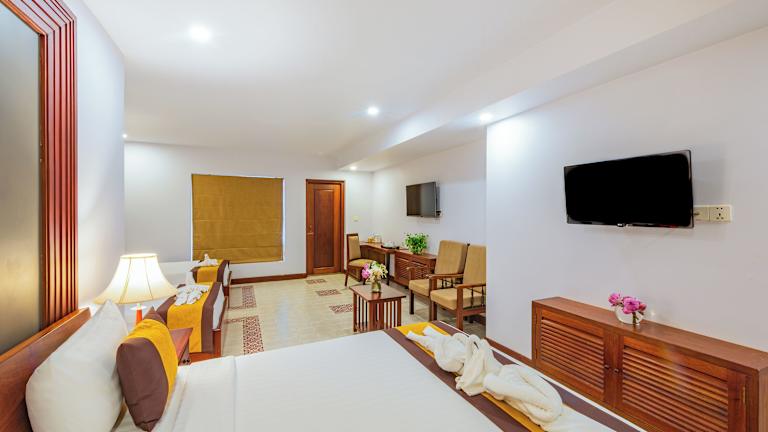 Die Zimmer im Shadow Angkor Residence sind klimatisiert und bieten einen komfortablen Aufenthalt. Jedes Zimmer verfügt über einen Flachbild-TV und einige Zimmer haben auch einen separaten Sitzbereich. Von einigen Zimmern aus können Sie einen herrlichen Blick auf den Fluss oder die Stadt genießen. Jedes Zimmer verfügt über ein eigenes Badezimmer mit Bademänteln und Hausschuhen.