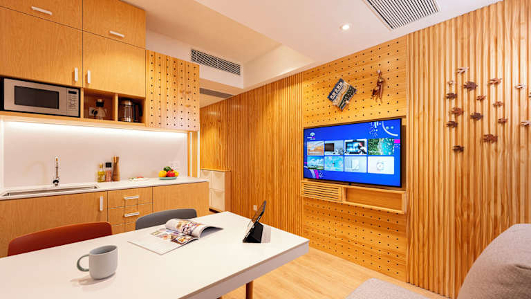 Einige Zimmer sind mit einer Küchenzeile ausgestattet, die eine Mikrowelle umfasst. Die Rezeption ist mit Mitarbeitenden besetzt, die Englisch und Chinesisch sprechen.