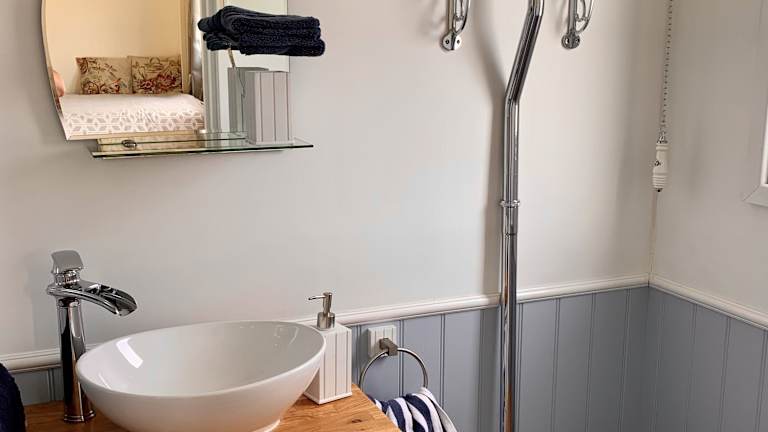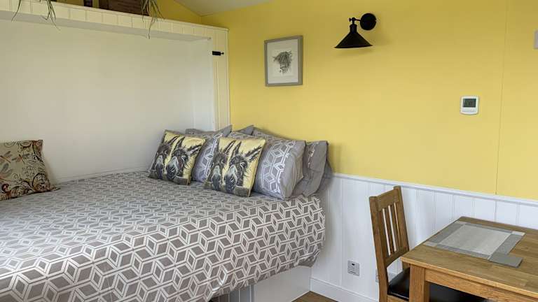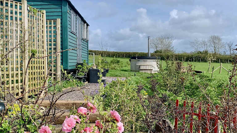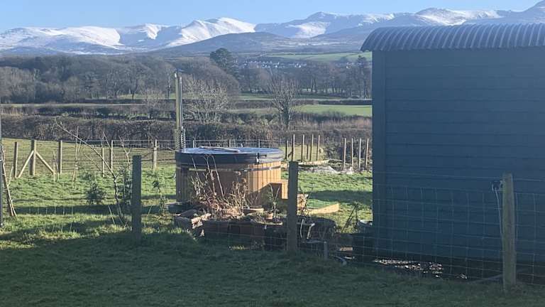 Shepherds Hut with Hot Tub North Wales Angelsey bietet Übernachtungsmöglichkeiten in einem gemütlichen Ferienhaus mit Zugang zu einem Whirlpool.