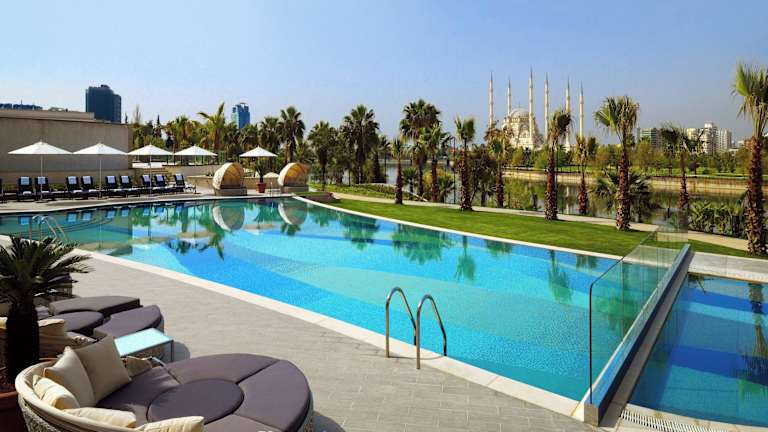 Das Sheraton Grand Adana in Adana bietet seinen Gästen ein komfortables und modernes Hotelambiente. Genießen Sie den Außenpool, den Innenpool, das Fitnesscenter und die verschiedenen gastronomischen Einrichtungen. Die Zimmer sind klimatisiert und bieten eine fantastische Aussicht auf den Fluss Seyhan. Das Hotel verfügt auch über eine exklusive Sheraton Club Lounge, ein Spa und ein Fitnesscenter. Die Lage im Zentrum von Adana ermöglicht einen einfachen Zugang zu Sehenswürdigkeiten und Einkaufsmöglichkeiten.