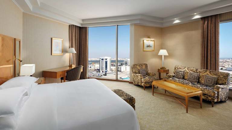 Die Zimmer im Sheraton Dammam Hotel & Convention Centre bieten einen atemberaubenden Panoramablick auf den Arabischen Golf. Sie sind in cremefarbenen Tönen gehalten und mit hochwertigen Stoffen und luxuriösen Möbeln ausgestattet. Zur Ausstattung gehören ein komfortables Bett, ein Schreibtisch, ein Flachbildfernseher und kostenfreies WLAN. Die Badezimmer verfügen über eine Badewanne oder eine Dusche sowie kostenlose Pflegeprodukte.