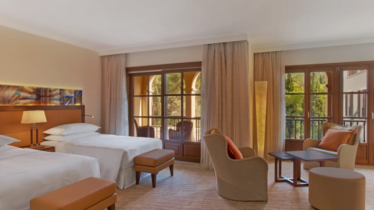 Das Sheraton Mallorca Arabella Golf Hotel liegt inmitten der Natur im Herzen eines Mittelmeergartens voller duftender Blumen, umgeben von den Fairways des Son Vida Golfplatzes und der eleganten Wohngegend gleichen Namens. Unser Hotel ist im spanischen Landhausstil eingerichtet und bietet seinen Gästen insgesamt 93 Zimmer und Suiten. Alle Zimmer spiegeln das entspannte Inselleben wider. Unsere Gäste können eine Atmosphäre aus sanften Farben und geschmackvollem Mobiliar genießen, mit wunderschönen mallorquinischen Details und einem einladenden Dekor. Nebst der stilvollen und komfortablen Inneneinrichtung bieten all unsere Zimmer einen atemberaubenden Ausblick und modernste Technologie, darunter Satellitenfernsehen, eine Stereoanlage, kabellosen Highspeed-Internetanschluss (gegen Gebühr) sowie ISDN- und Laptopanschluss. Für mehr Komfort und Bequemlichkeit verfügt jedes Zimmer über eine individuell steuerbare Klimaanlage, Kaffeemaschinen und unser Sheraton Signature Sleep Experience Bett. Freuen Sie sich nach einem ereignisreichen Tag mit Freunden, Familie oder geschäftlichen Angelegenheiten auf Ihr gemütliches Zimmer im Sheraton (alle Zimmer sind übrigens Nichtraucherzimmer).