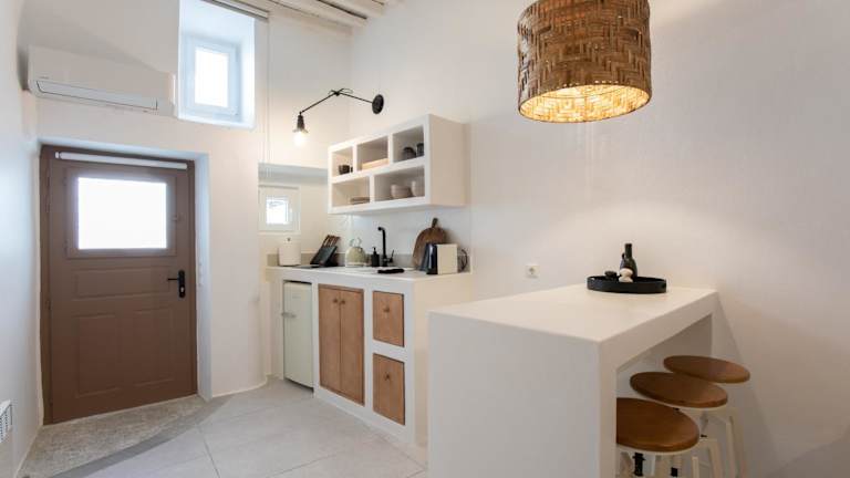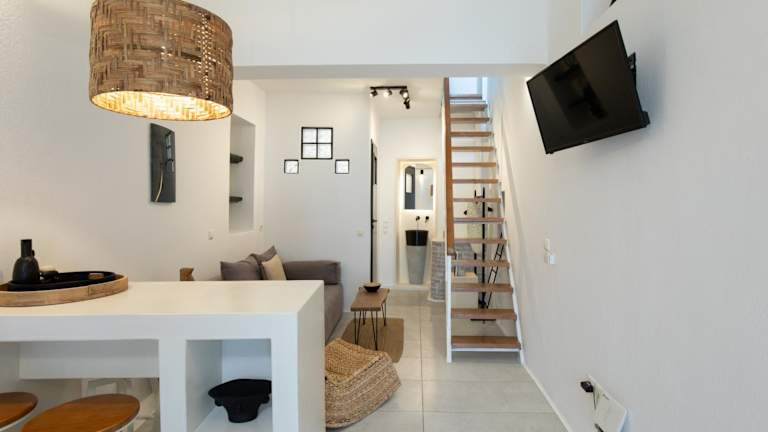 Das Alefkandra Studio bietet elegante Unterkünfte zur Selbstverpflegung. Das Apartment erstreckt sich über zwei Ebenen und ist geschmackvoll eingerichtet. Im Erdgeschoss befindet sich eine offene Küchenzeile mit einem gemütlichen Sitz- und Essbereich. Auf der oberen Ebene finden Sie ein komfortables Schlafzimmer mit einem Doppelbett. Das Badezimmer ist mit Bademänteln und kostenlosen Pflegeprodukten ausgestattet. Zur weiteren Ausstattung gehören ein Plasma-TV, ein Bügeleisen, ein Kühlschrank und ein Kochfeld.