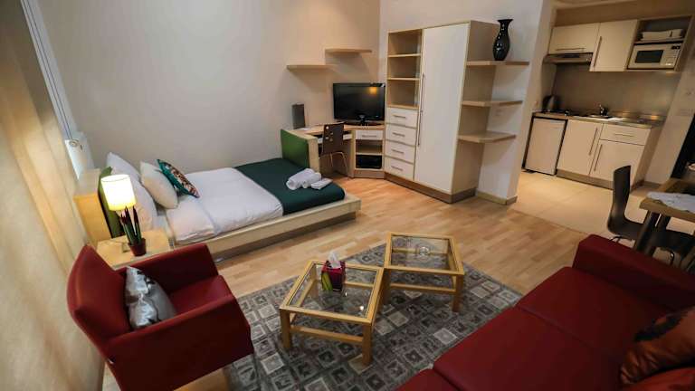 Die klimatisierten Suiten und Studios im Hotel Sky Suites bieten einen komfortablen Rückzugsort mit moderner Ausstattung. Jede Unterkunft verfügt über einen Balkon, der einen herrlichen Ausblick bietet. Das Wohnzimmer ist offen gestaltet und mit einem Sat-TV und einem DVD-Player ausgestattet. Die Küche ist gut ausgestattet und verfügt über eine Mikrowelle sowie einen Esstisch.