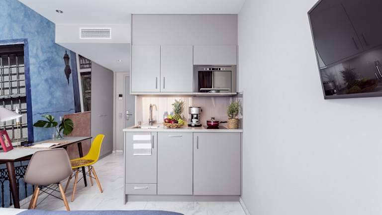 Die Zimmer sind mit Klimaanlage, einer voll ausgestatteten Küchenzeile, einem Flachbild-TV und einem eigenen Badezimmer ausgestattet. Die Küchenzeile bietet einen Kühlschrank, eine Mikrowelle, eine Herdplatte, eine Kaffeemaschine und einen Wasserkocher. Pflegeprodukte, Haartrockner und Bettwäsche sind ebenfalls vorhanden. Es wird kein täglicher Reinigungsservice angeboten.