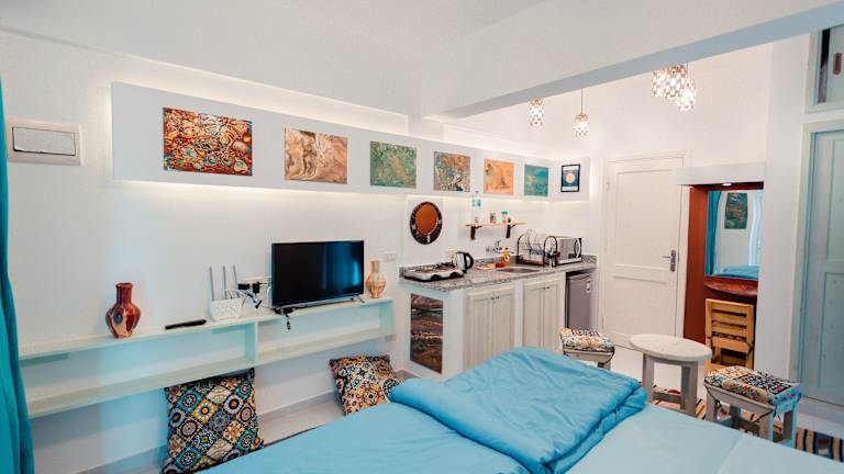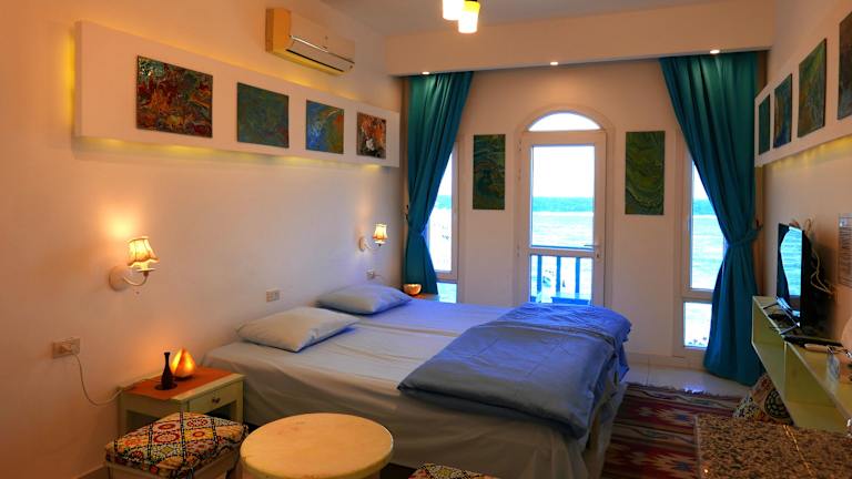 Die klimatisierten Zimmer im Skyrock Dahab sind komfortabel und bieten eine Terrasse oder einen Balkon mit herrlichem Blick auf das Meer und die Berge. Jedes Zimmer verfügt über einen gemütlichen Sitzbereich, einen Flachbild-Sat-TV und eine praktische Küchenzeile mit Kühlschrank, Mikrowelle, Kochfeld und Wasserkocher.