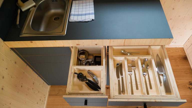 Das Ferienhaus verfügt über eine eigene Küche, ausgestattet mit Kühlschrank, Herdplatte und Wasserkocher. Es werden Handtücher und Bettwäsche bereitgestellt.