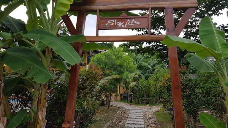 Slow Life Sabaidee Pai bietet Übernachtungsmöglichkeiten mit Bergblick. Die Unterkunft verfügt über einen Garten, eine Gemeinschaftslounge, eine Terrasse und eine Bar. Kostenloses WLAN ist vorhanden. Zu den Einrichtungen gehören auch ein Informationsschalter für Ausflüge sowie Parkmöglichkeiten.