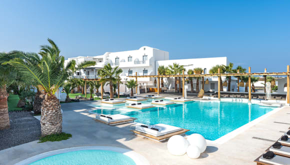 Das Hotel befindet sich im Ort Monolithos, etwa 200 m vom Sand- und Kiesstrand von Kamari entfernt und ca. 9 km vom Stadtzentrum von Fira.