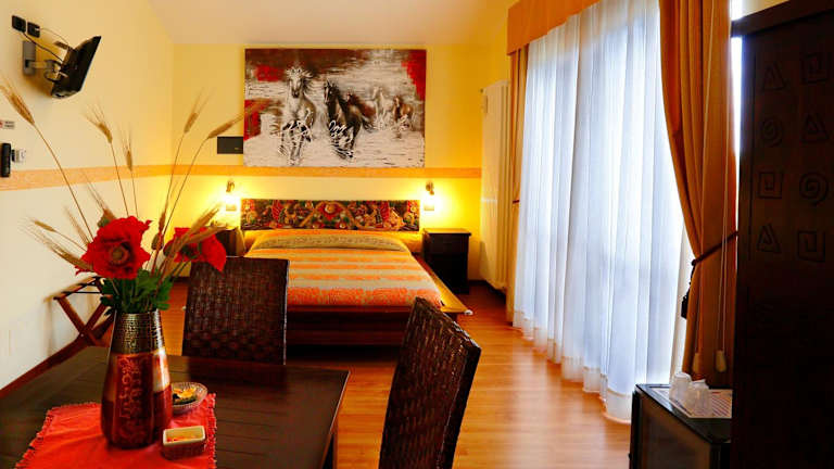 Die klimatisierten Zimmer sind mit einem Schreibtisch, einem Wasserkocher, einem Kühlschrank, einer Minibar, einem Safe, einem Flachbild-TV sowie einer Terrasse ausgestattet. Jedes Zimmer verfügt über ein eigenes Badezimmer mit einem Bidet und einen Kleiderschrank.
