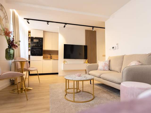 Die Ferienwohnung verfügt über 1 Schlafzimmer, 1 Badezimmer, Bettwäsche, Handtücher, einen Flachbild-TV, einen Essbereich, eine voll ausgestattete Küche und eine Terrasse mit Blick auf die Stadt.