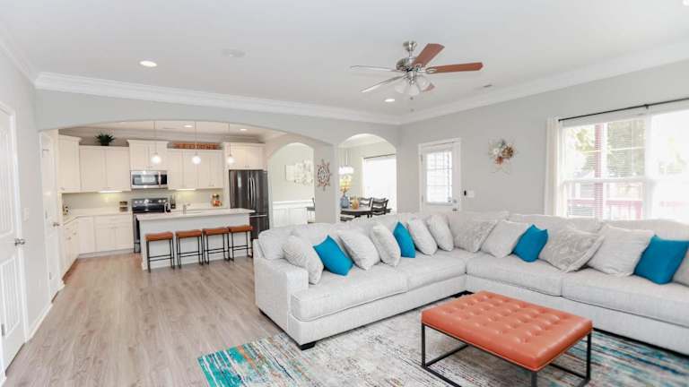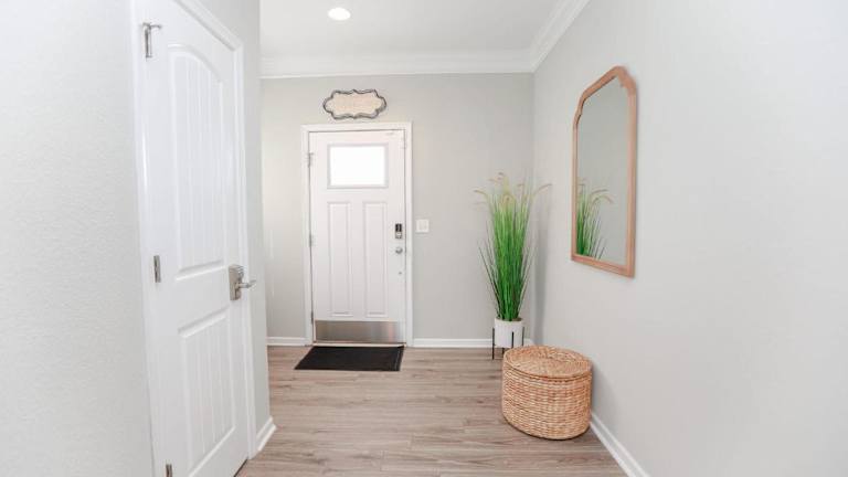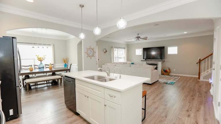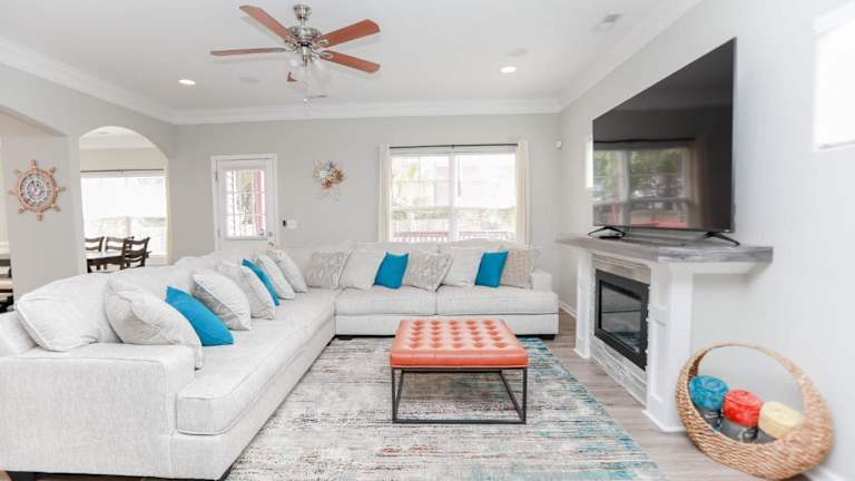 Sojourn Palm Tree Family Oasis 4 BR bietet Übernachtungsmöglichkeiten in Form eines Ferienhauses, ausgestattet mit kostenlosem WLAN, Klimaanlage und einem Garten. Die Unterkunft verfügt über eine Veranda/Patio und ist mit einem TV eingerichtet.