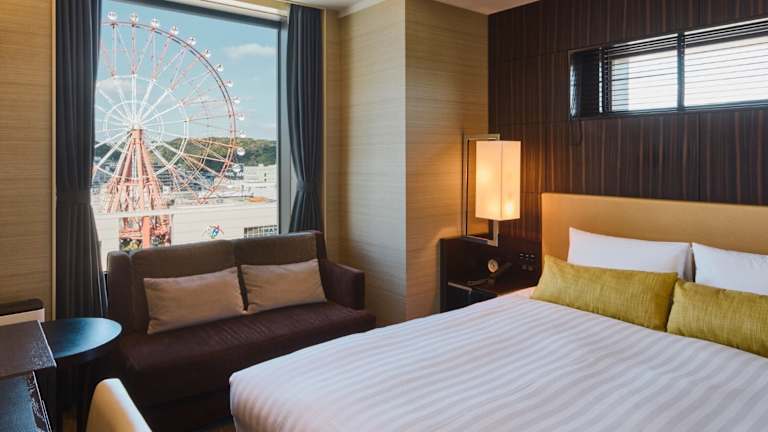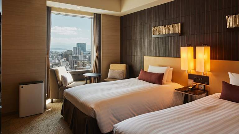 Die Zimmer des Solaria Nishitetsu Hotels sind modern gestaltet und verfügen über Klimaanlage, Heizung sowie ein Doppel- oder Queensize-Bett. Ausstattungen wie ein Kühlschrank, ein Safe, ein Telefon, ein TV-Gerät und kostenloses WLAN sind vorhanden. Die Badezimmer sind mit einer Dusche, Badewanne und einem Haartrockner ausgestattet. Außerdem bieten einige Zimmer Ausblicke auf den Vulkan Sakurajima.