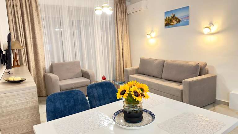Das Modern OneBedroom Apartment 9 Saranda Terraces ist eine ideale Unterkunft in Saranda mit einem wunderschönen Meerblick und kostenfreiem WLAN. Das klimatisierte Apartment verfügt über ein Schlafzimmer, ein Wohnzimmer und eine voll ausgestattete Küche. Ein Flachbild-TV sorgt für Unterhaltung und Privatparkplätze stehen zur Verfügung. Die Lage ist perfekt, um die beliebten Strände von Saranda zu erkunden.
