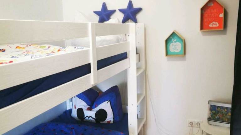 Die Ferienwohnung verfügt über zwei Schlafzimmer und eine Küchenzeile, die mit einem Kühlschrank, einem Geschirrspüler und einer Kaffeemaschine ausgestattet ist. Es gibt auch einen Kinderspielplatz für die Gäste.