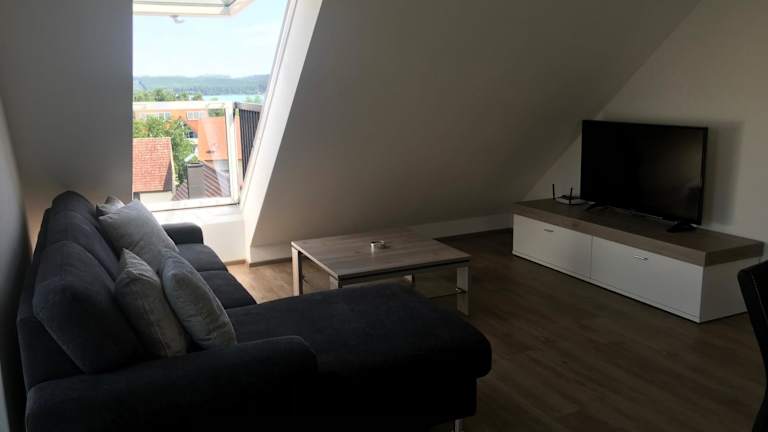 Sonniges 4 **** DG-Apartment mit Aufzug+Seeblick ist eine klimatisierte Unterkunft, die ein modernes Ambiente mit praktischen Annehmlichkeiten verbindet. Kostenfreies WLAN und ein Privatparkplatz sind ebenfalls vorhanden.