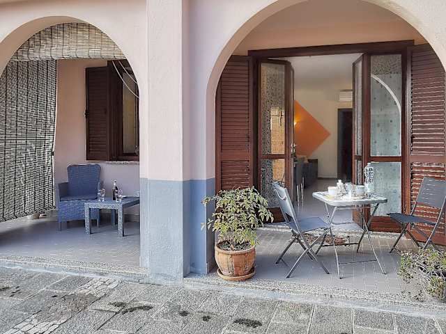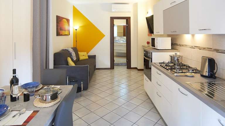 Die Ferienwohnung besteht aus einem Schlafzimmer und einem Wohnzimmer. Die Ausstattung umfasst eine voll ausgestattete Küchenzeile mit Kühlschrank und Kaffeemaschine sowie ein Badezimmer mit Bidet und Dusche. Klimaanlage ist ebenfalls vorhanden.