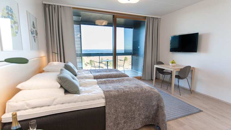 Die Zimmer im Santa's Resort & Spa Hotel Sani sind mit einem TV, einer Minibar und Parkettböden ausgestattet. Einige Zimmer verfügen über einen verglasten Balkon mit Blick auf die Bucht, während andere über einen französischen Balkon verfügen.