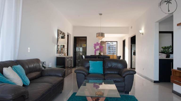 Die Ferienwohnung umfasst 3 separate Schlafzimmer, eine voll ausgestattete Küche mit Kühlschrank und Ofen sowie 2 Badezimmer. Klimaanlage, Handtücher und Bettwäsche sind ebenfalls vorhanden.