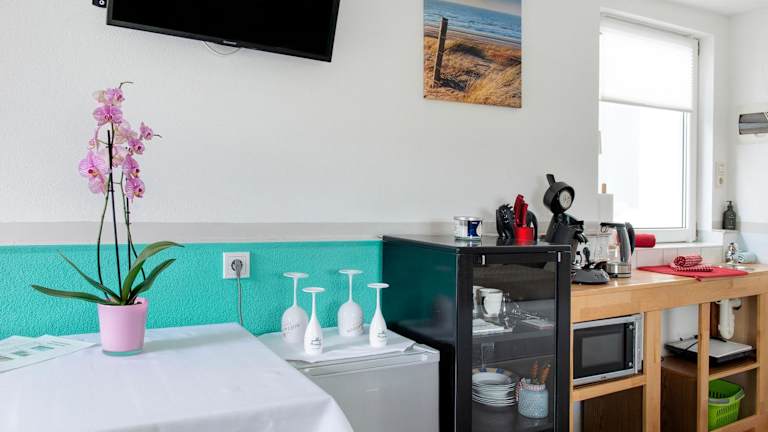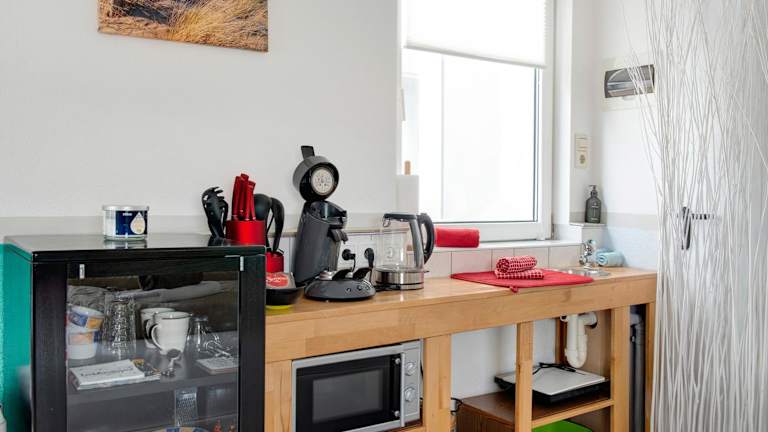 Die Einrichtung umfasst eine voll ausgestattete Küche mit einem Kühlschrank, einer Mikrowelle, einer Herdplatte sowie einer Kaffeemaschine und einem Wasserkocher. Weitere Informationen zu Verpflegungsmöglichkeiten sind nicht verfügbar.