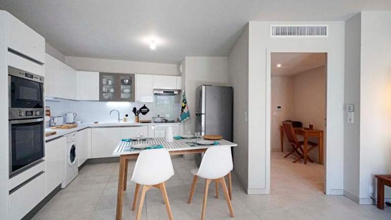 Das Appartement besteht aus einem Schlafzimmer, einem Wohnzimmer und einem Badezimmer mit Dusche und kostenfreien Pflegeprodukten. Handtücher und Bettwäsche werden gestellt und die Wohnung ist klimatisiert.