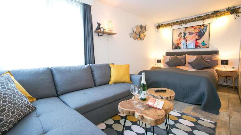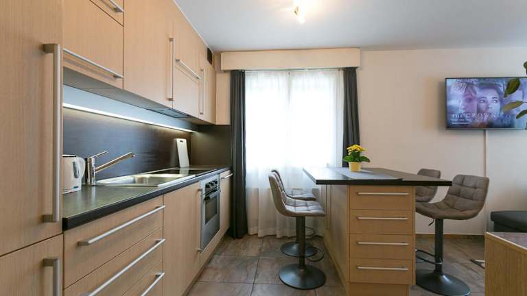 Das Studio-Apartment bietet Platz für zwei Personen und verfügt über alle Annehmlichkeiten, die Sie für einen angenehmen Aufenthalt benötigen. Ein Flachbild-Sat-TV sorgt für Unterhaltung, während die gut ausgestattete Küche mit einem Kühlschrank, einem Geschirrspüler und einem Backofen Ihnen die Möglichkeit bietet, Ihre eigenen Mahlzeiten zuzubereiten. Das Badezimmer ist mit einer Badewanne und kostenlosen Pflegeprodukten ausgestattet. Genießen Sie den Blick auf die Berge von Ihrem Apartment aus.