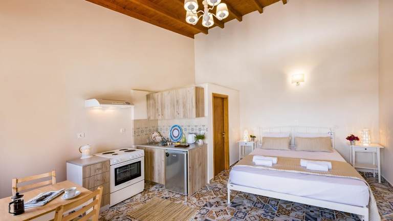 Die klimatisierten Zimmer im Hotel Spitakia sind mit modernem Dekor und traditionellen Elementen gestaltet. Jedes Zimmer verfügt über eine voll ausgestattete Küche, in der Sie Ihre eigenen Mahlzeiten zubereiten können. Die großen Fenster bieten Ihnen einen herrlichen Blick auf das Meer und das Dorf. Die Zimmer sind komfortabel eingerichtet und bieten Ihnen alles, was Sie für einen angenehmen Aufenthalt benötigen.