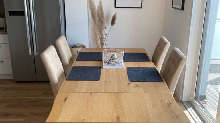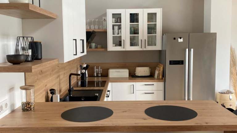 Die Ferienwohnung bietet eine voll ausgestattete Küche mit Kühlschrank, Geschirrspüler und Ofen. Möglichkeiten zur Lebensmittellieferung sind gegen Gebühren möglich. Zusätzliche Verpflegungsangebot werden nicht beschrieben.