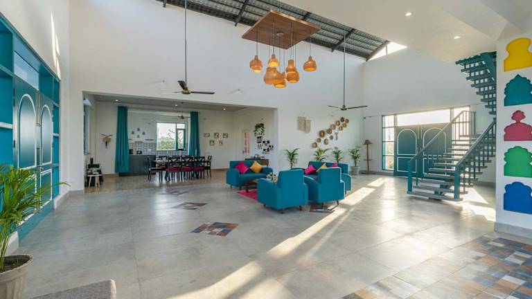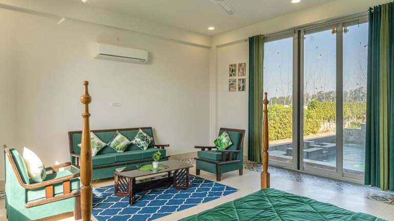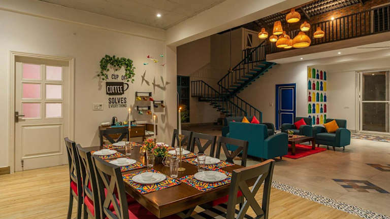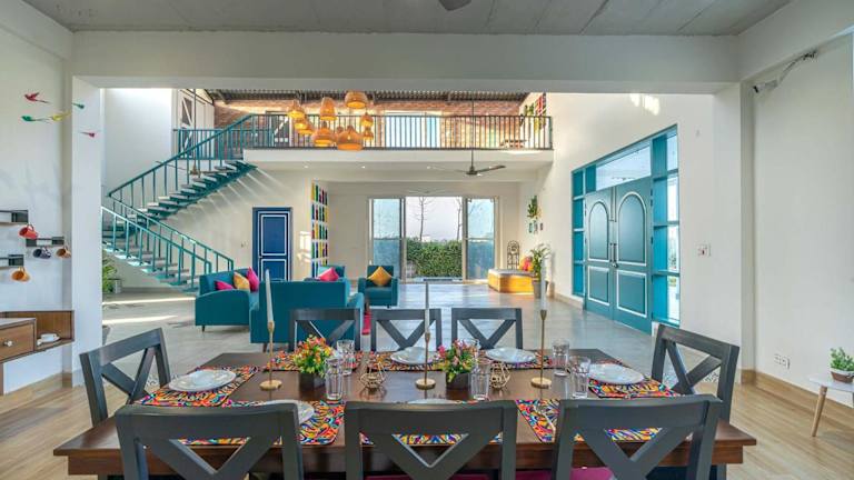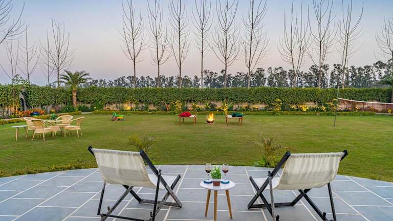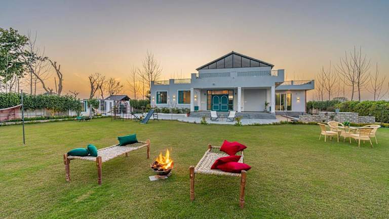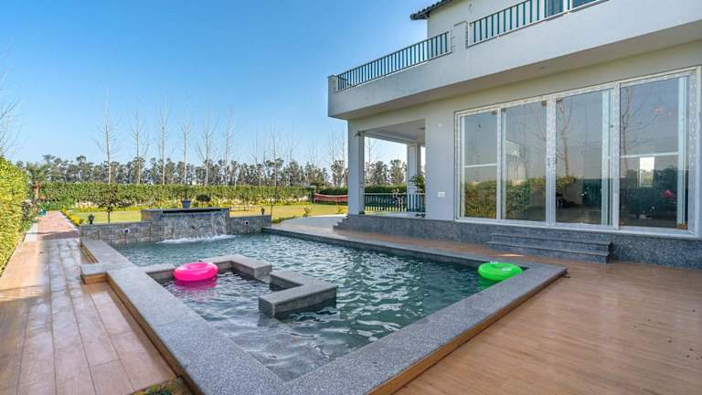 Das StayVista at Colour Bloom - Luxury Farm Stay in Karnal bietet eine komfortable Villa mit eigenem Pool und Garten. Die Unterkunft ist ausgestattet mit einem Außenpool und verfügt über einen Balkon mit Blick auf den Pool. Gästen stehen Parkmöglichkeiten zur Verfügung, die einen Privatparkplatz inklusive haben.