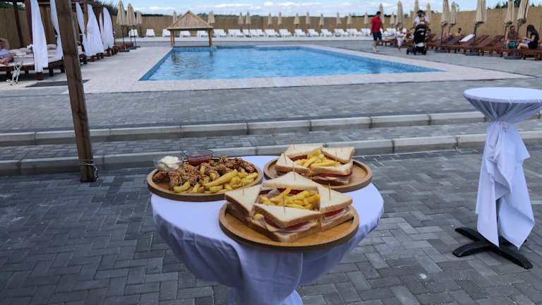 Es gibt eine Poolbar sowie ein Café vor Ort, welches verschiedene Verpflegungsmöglichkeiten bereitstellt. Lunchpakete können auf Anfrage bereitgestellt werden.