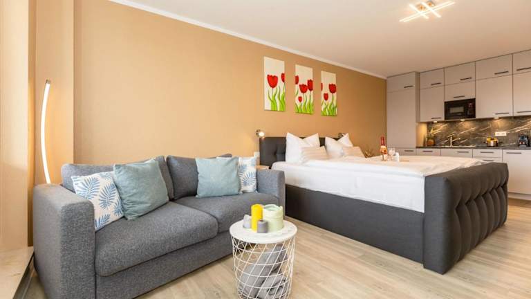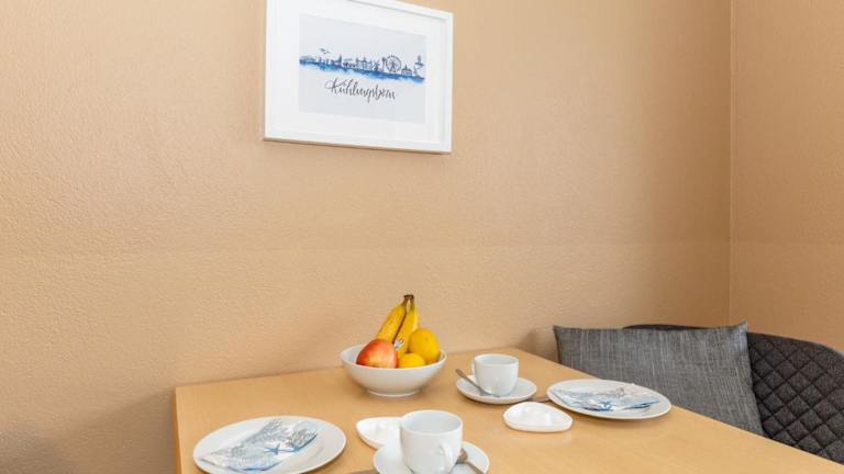 Die Ferienwohnung verfügt über ein Schlafzimmer, ein Wohnzimmer und eine voll ausgestattete Küchenzeile mit Kühlschrank sowie Kaffeemaschine. Das Badezimmer ist mit einer Dusche und einem Haartrockner ausgestattet. Gegen Aufpreis können Handtücher und Bettwäsche zur Verfügung gestellt werden. Es stehen außerdem schallisolierte Zimmer zur Verfügung.